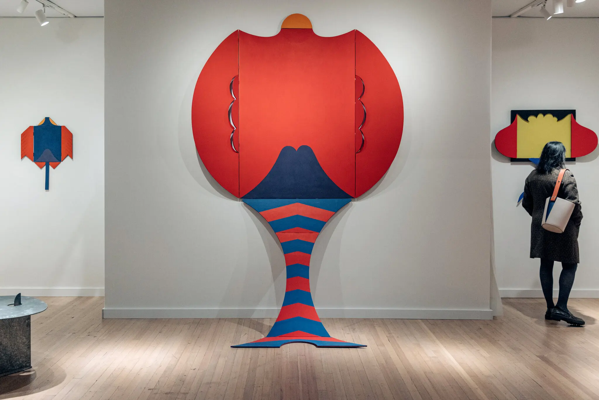 Các đồ vật bằng gỗ dán gắn tường của Katsumi Nakai (1927-2013) — các ví dụ ở đây có niên đại từ những năm 1960 đến những năm 1980 — tạo nên một trong những màn trình diễn ấn tượng nhất của hội chợ. Được sơn bằng những màu sắc sống động nhưng đơn giản, gợi lên thiết kế nhiều như nghệ thuật, tất cả đều có cửa hoặc nắp, mở. Các đường cắt trên một hình chữ nhật màu xanh lam nhạt để lộ các miếng chèn hình cánh bướm màu vàng kim; tác phẩm lớn nhất có đuôi giống như cá đuối manta. Bản lề là chìa khóa — rõ ràng là hấp dẫn, chúng khiến các tác phẩm vừa lộ liễu vừa không cam kết.