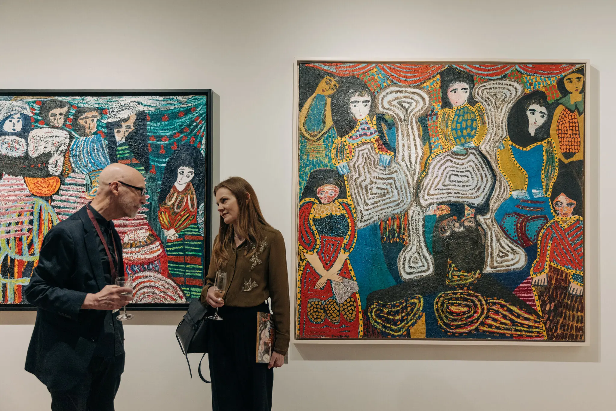 Sau khi được chẩn đoán mắc chứng tâm thần phân liệt hoang tưởng khi còn trẻ, Franne Davids (1950-2022) đã dành phần đời còn lại của mình tại nhà cha mẹ cô ở Connecticut, sử dụng tầng hầm làm xưởng vẽ. Thỉnh thoảng cô mạo hiểm đến Bảo tàng Nghệ thuật Hiện đại. Cuối cùng, cô đã để lại hơn 500 tác phẩm trên giấy và 42 bức tranh lớn. Trong triển lãm này, tác phẩm đầu tay của cô tại New York sau khi mất, các tác phẩm chắp vá gợi nhớ đến Klimt và màu vàng và đỏ sẫm dường như được lấy từ một câu chuyện cổ tích Nga nào đó; các vòng tròn đồng tâm và các đường thẳng song song đóng vai trò như rèm cửa và tay áo phồng và lấp đầy khoảng trống giữa các cơ thể bằng những đợt năng lượng tỏa ra.