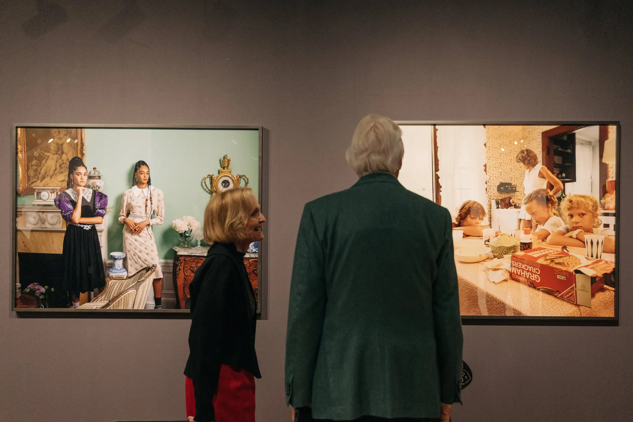 Năm bức ảnh lớn của Tina Barney chào đón du khách đến Triển lãm nghệ thuật với sự kết hợp đặc trưng của nghệ sĩ giữa sự quan sát kỹ lưỡng, bố cục phức tạp và sự tách biệt vô tư. (Những bức ảnh này, cũng xuất hiện trong triển lãm hồi tưởng hiện tại của Barney tại Jeu de Paume ở Paris, không phải là mới, nhưng chúng hiếm khi được trưng bày ở New York.) Trong một bức ảnh ấn tượng từ đầu những năm 1980, bốn đứa trẻ và mẹ của chúng, hầu hết đều mặc đồ trắng, nhìn theo những hướng khác nhau đằng sau một bức ảnh cận cảnh trên một hộp bánh quy graham bị lật úp. Như thể toàn bộ tính nhân văn của cảnh này đã được tính trung bình giữa tất cả các nhân vật của nó, bao gồm cả hộp màu đỏ rỗng.