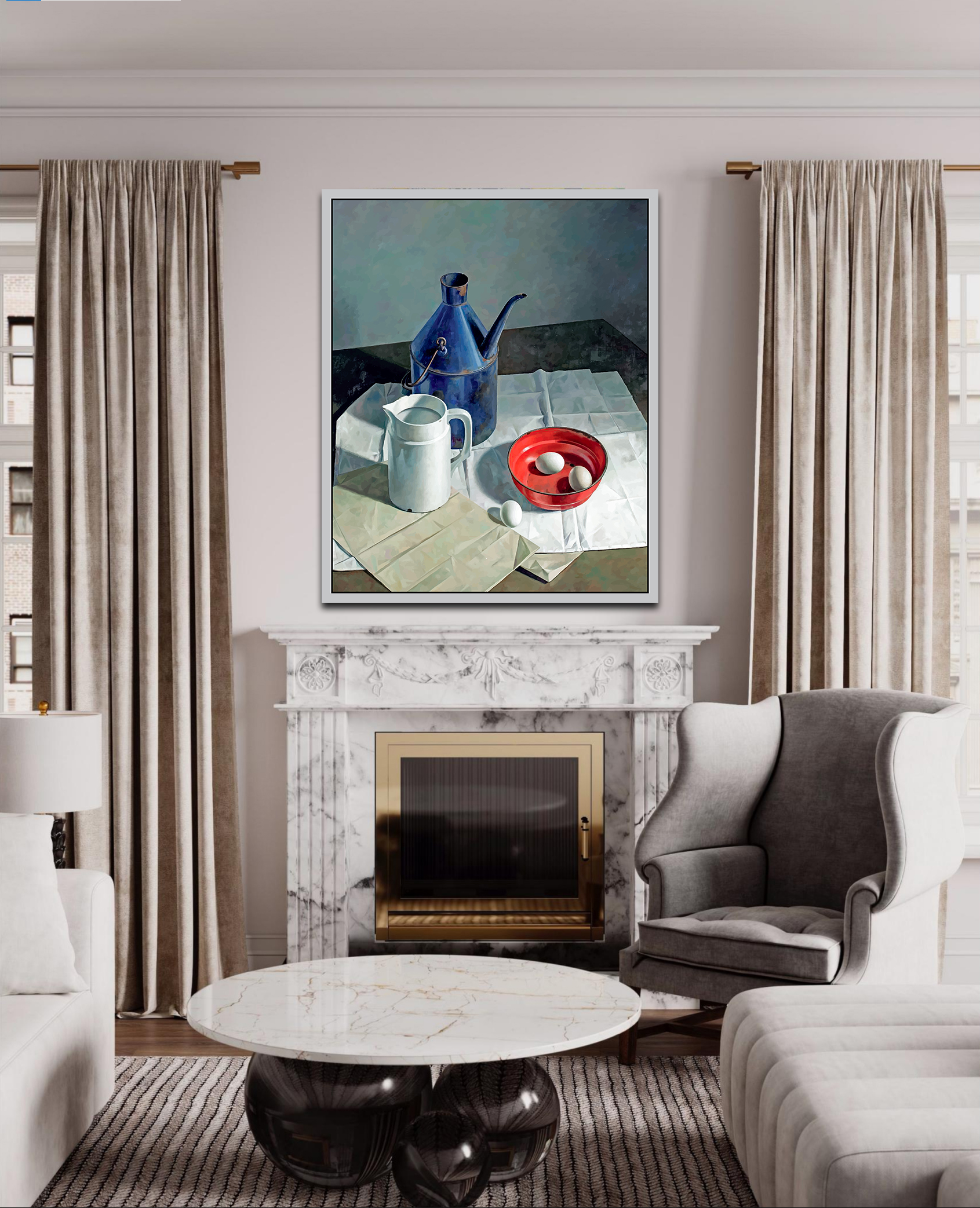 Bức tranh này là một tác phẩm tĩnh vật tối giản với các vật dụng hàng ngày: một chiếc bình kim loại màu xanh, một chiếc bình gốm màu trắng, một chiếc bát màu đỏ đựng trứng và một tờ giấy gấp. Sự đơn giản của chủ đề tương phản với sự chú ý tỉ mỉ đến ánh sáng, bóng tối và hình dạng, tạo nên bầu không khí thanh bình và trầm ngâm. Nghệ sĩ sử dụng các hiệu ứng chuyển màu mềm mại ở phần nền và sắp xếp cẩn thận các vật thể cho phép người xem tập trung