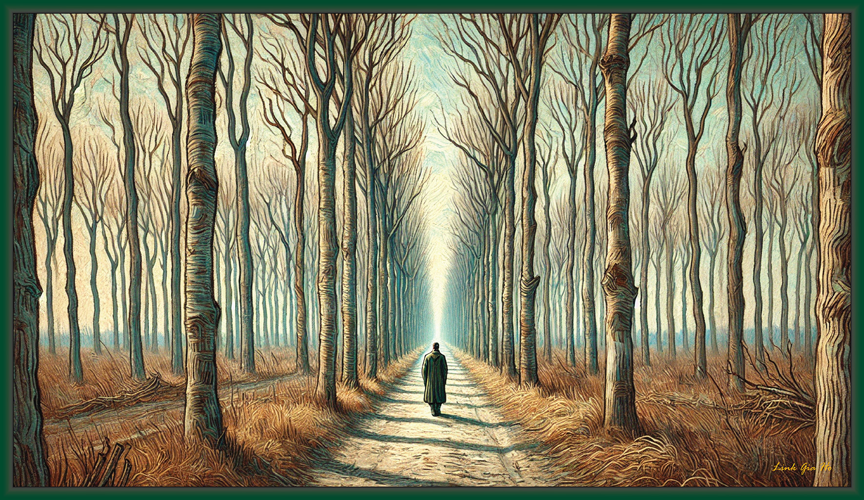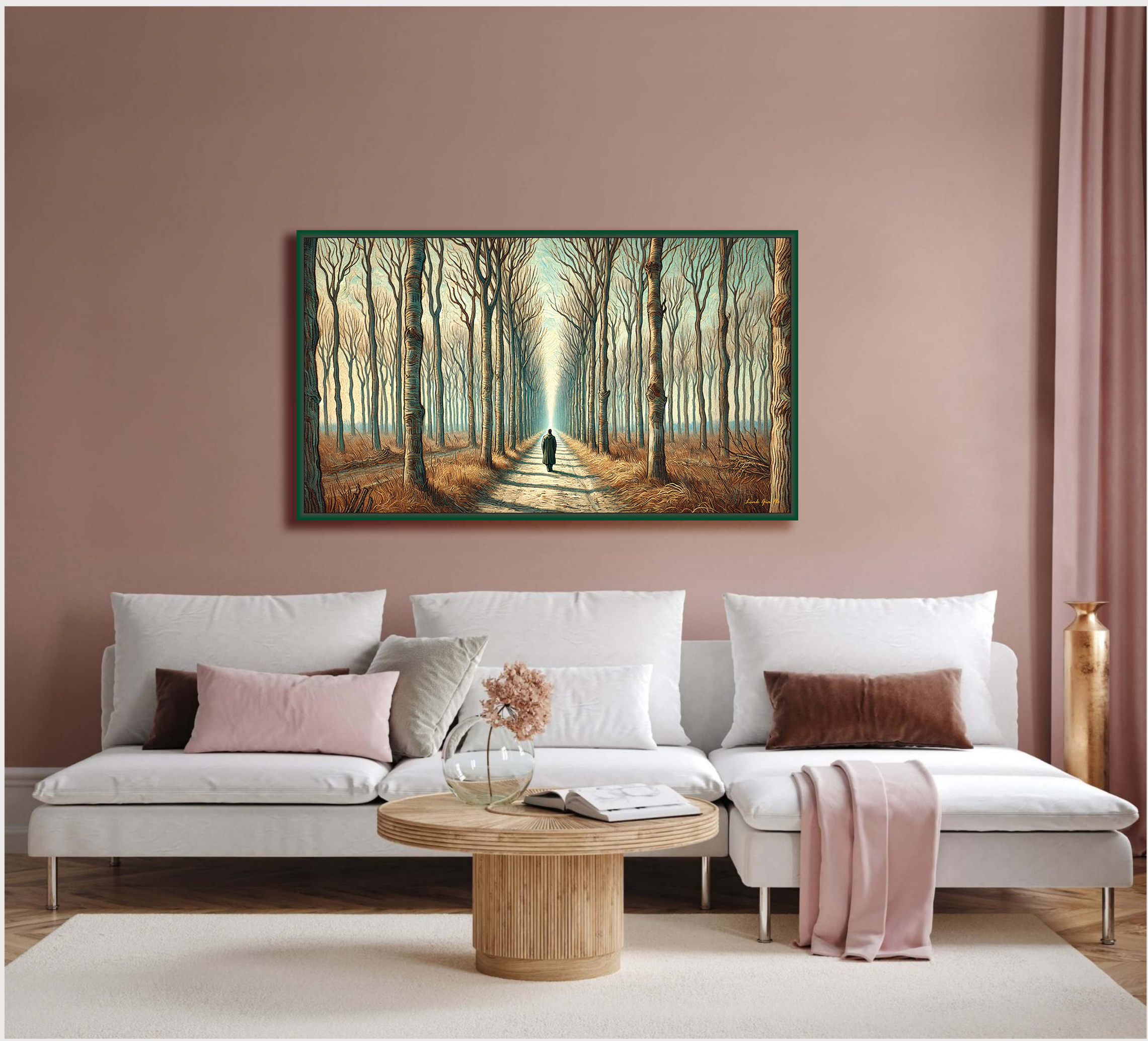 Bức tranh mở ra một “đường hầm” của những thân cây thẳng tắp – nơi mọi đường nét đều hội tụ vào một điểm sáng ở cuối con đường. Người lữ khách khoác áo dài đi một mình, nhưng tuyệt nhiên không cô độc: ánh sáng phía trước ôm lấy bước chân, còn nhịp vân trên thân cây như những dòng ký ức dẫn đường. Sự tương phản giữa cỏ vàng ấm và bầu trời xanh ngọc lạnh tạo nên nhịp tâm trạng vừa tĩnh tại vừa bền bỉ. Tác phẩm gợi nhắc tinh thần hậu ấn tượng: nhấn nhá chất liệu, nhịp nét, và cảm xúc nội tâm nhiều hơn là tả thực. Treo bức tranh này trong phòng khách, sảnh, hành lang hoặc góc thiền sẽ tạo trục nhìn sâu, mở rộng không gian, đồng thời truyền tải thông điệp rõ ràng: đi tiếp – phía trước là ánh sáng. “Đi một mình nhưng không hề lạc lõng. Con đường nào cũng có điểm sáng chờ ta.”