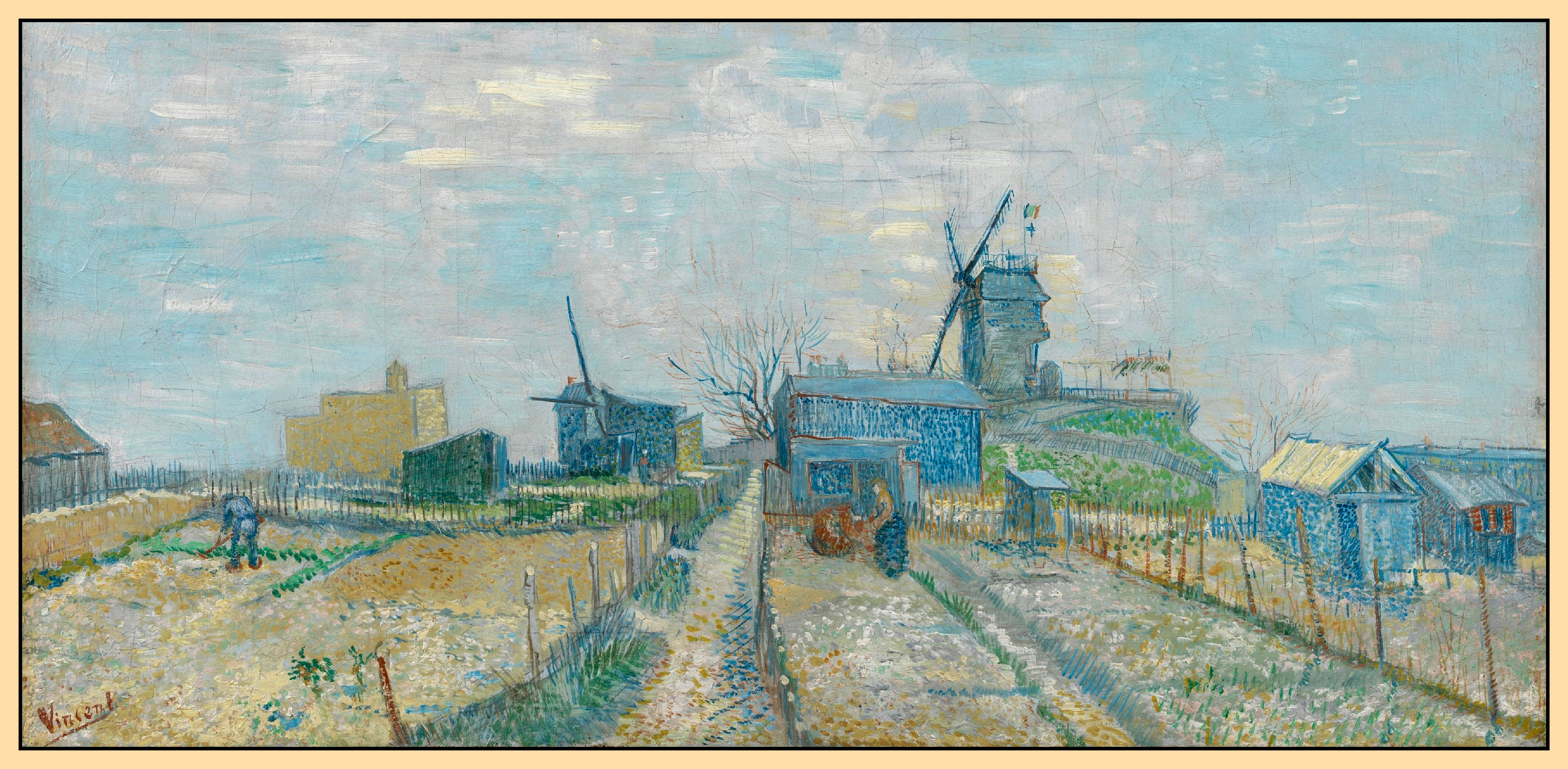 Bức tranh “Montmartre: Cối xay gió và Allotment” của Van Gogh là một tác phẩm ấn tượng, miêu tả cảnh quan vùng Montmartre, nơi ông từng sống và làm việc. Bức tranh mang đến cảm giác bình dị và yên bình của một vùng nông thôn giữa thành phố, nơi những chiếc cối xay gió trở thành điểm nhấn đặc trưng cho Montmartre trong thế kỷ 19.
