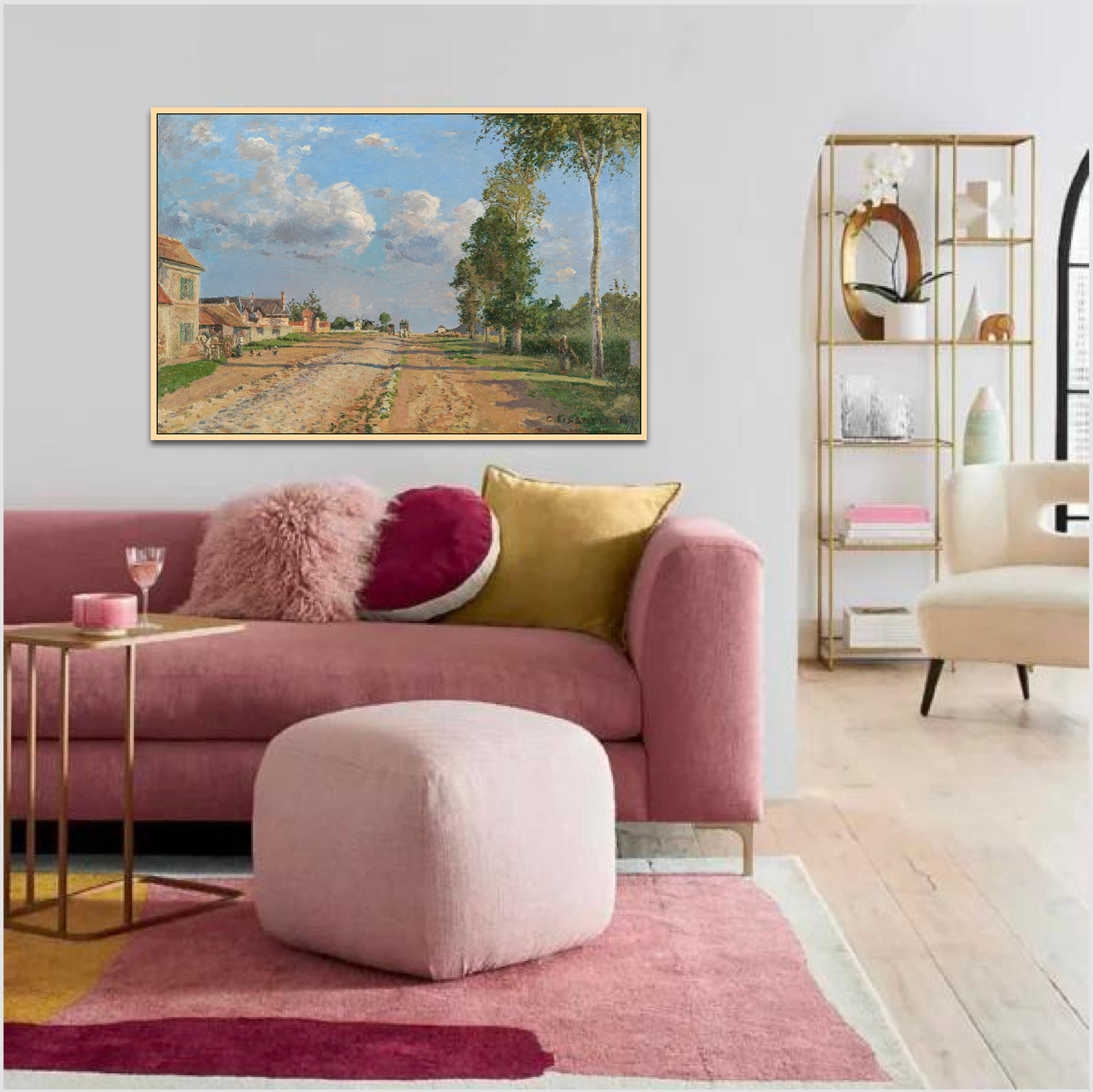 Bức tranh “Tuyến đường Versailles, Rocquencourt” của Camille Pissarro là một ví dụ hoàn hảo cho phong cách ấn tượng đặc trưng của ông. Tác phẩm thể hiện một cảnh quan đồng quê yên bình với người phụ nữ đứng giữa con đường, bên cạnh là cỏ cây xanh mướt và nền trời xanh rộng lớn với những đám mây nhẹ nhàng. Bức tranh này mang lại cảm giác về sự hài hòa giữa con người và thiên nhiên, với những tông màu nhẹ nhàng và cách xử lý ánh sáng tự nhiên một cách tinh tế.